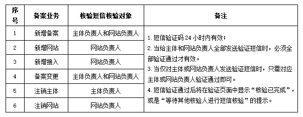 1:用戶提交的備案類型是首次新增備案時,主體負責人(法人)及網站負責人手機號驗證碼均需驗證。